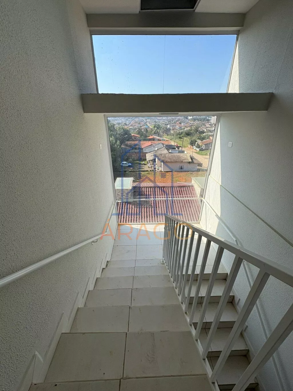 Fachada do living e escadaria em vidro