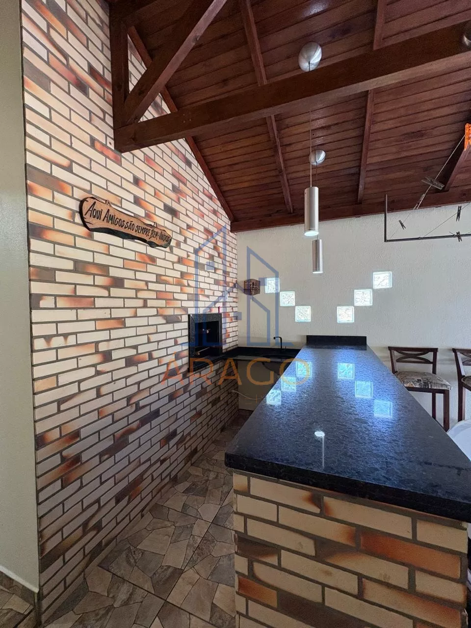 Área de festas com churrasqueira e tampo em mármore